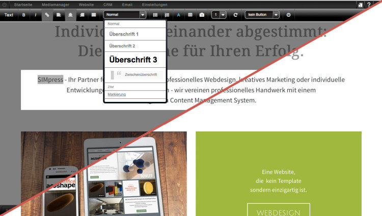 Vergiss Photoshop und mühevolle Umsetzung in HTML & CSS. Mit mySIMdesign erstellst du Dein Wunschdesign direkt im CMS. Ohne Codekenntnisse. Aber mit einem sensationellen Website-Builder.